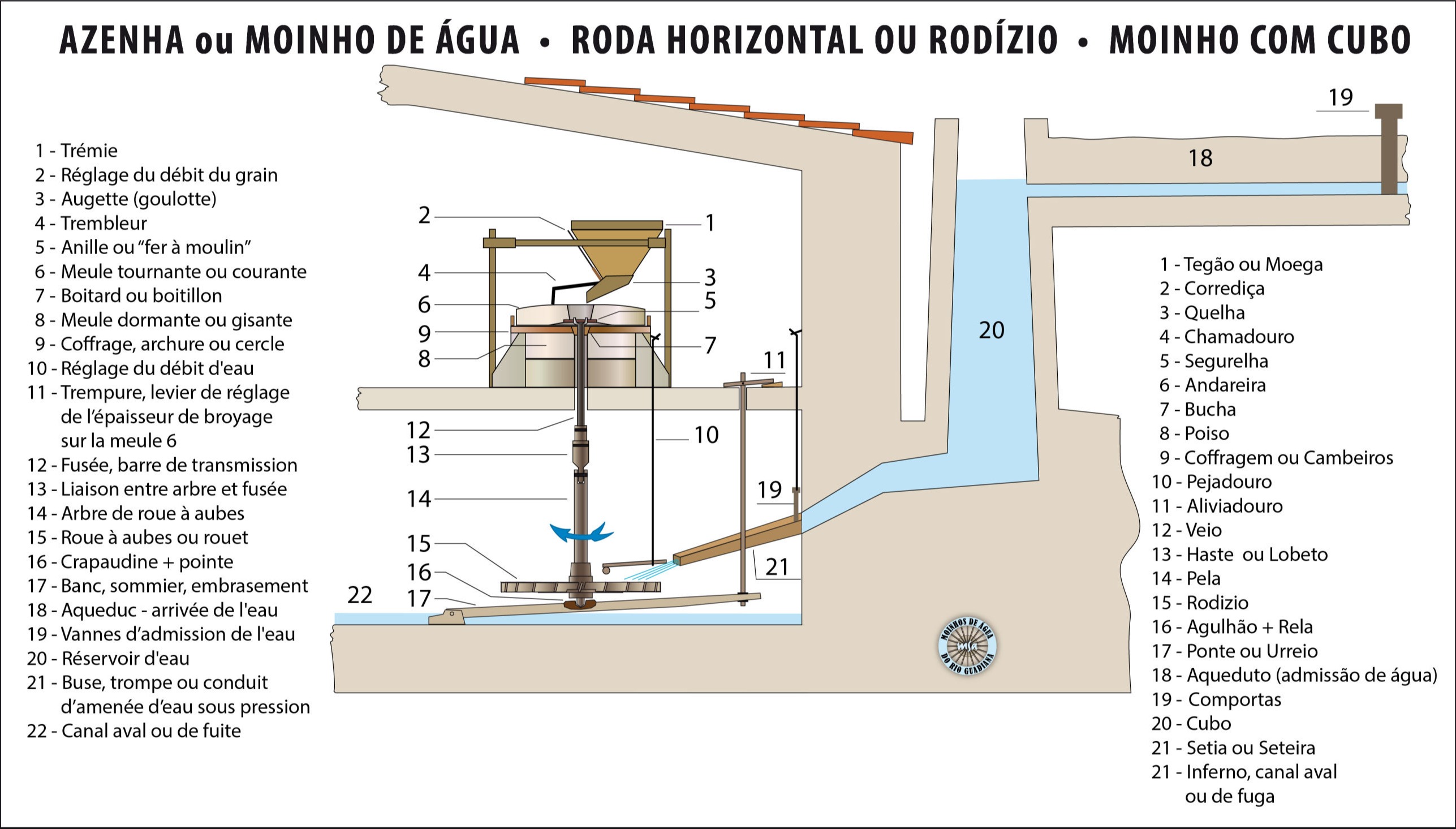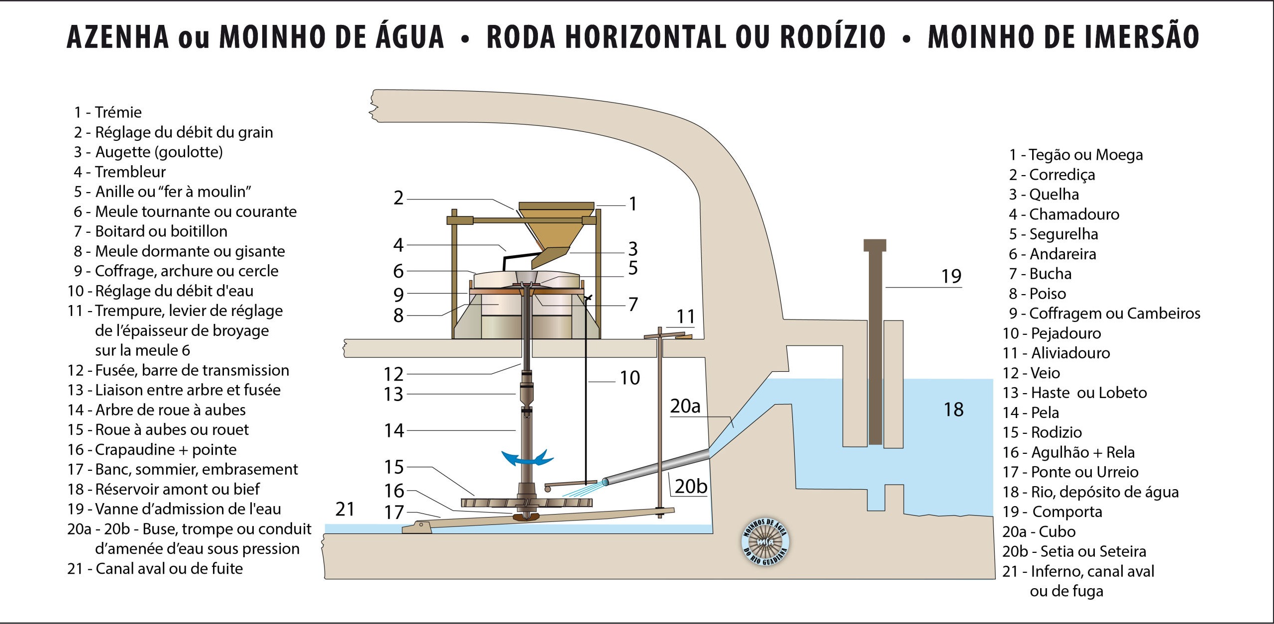 Au Portugal, l'introduction des moulins à eau est certainement due aux Romains, appelés moulins “roda horizontal ou rodizio”, ils sont le plus souvent construits dans les régions du nord du pays. En 1968 et selon l'auteur Jorge Dias, au Portugal il existait environ 3.000 moulins à vent encore en fonctionnement, et environ 7.000 à eau dont 5000 d'entre eux étaient à roue à aube horizontale de type "rodizio".