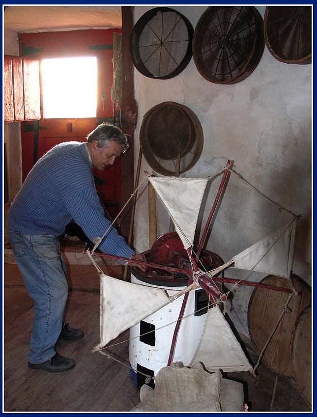 Antes de visitar, o Mestre do Moinho explica o funcionamento com uma maqueta realizada pelo seu pai, último moleiro do moinho.
